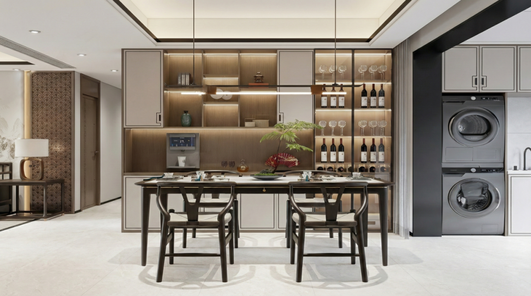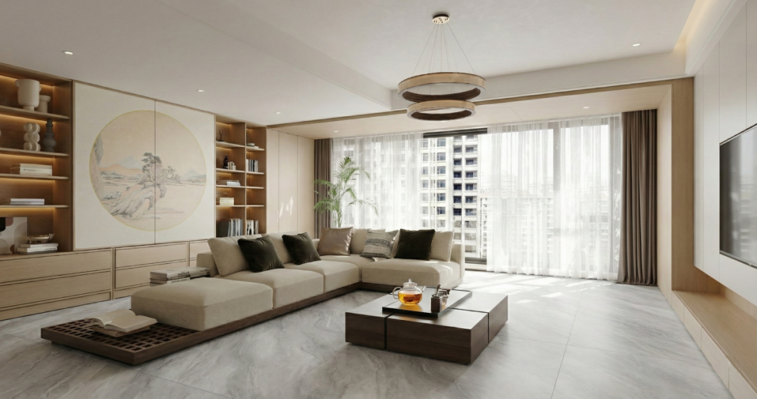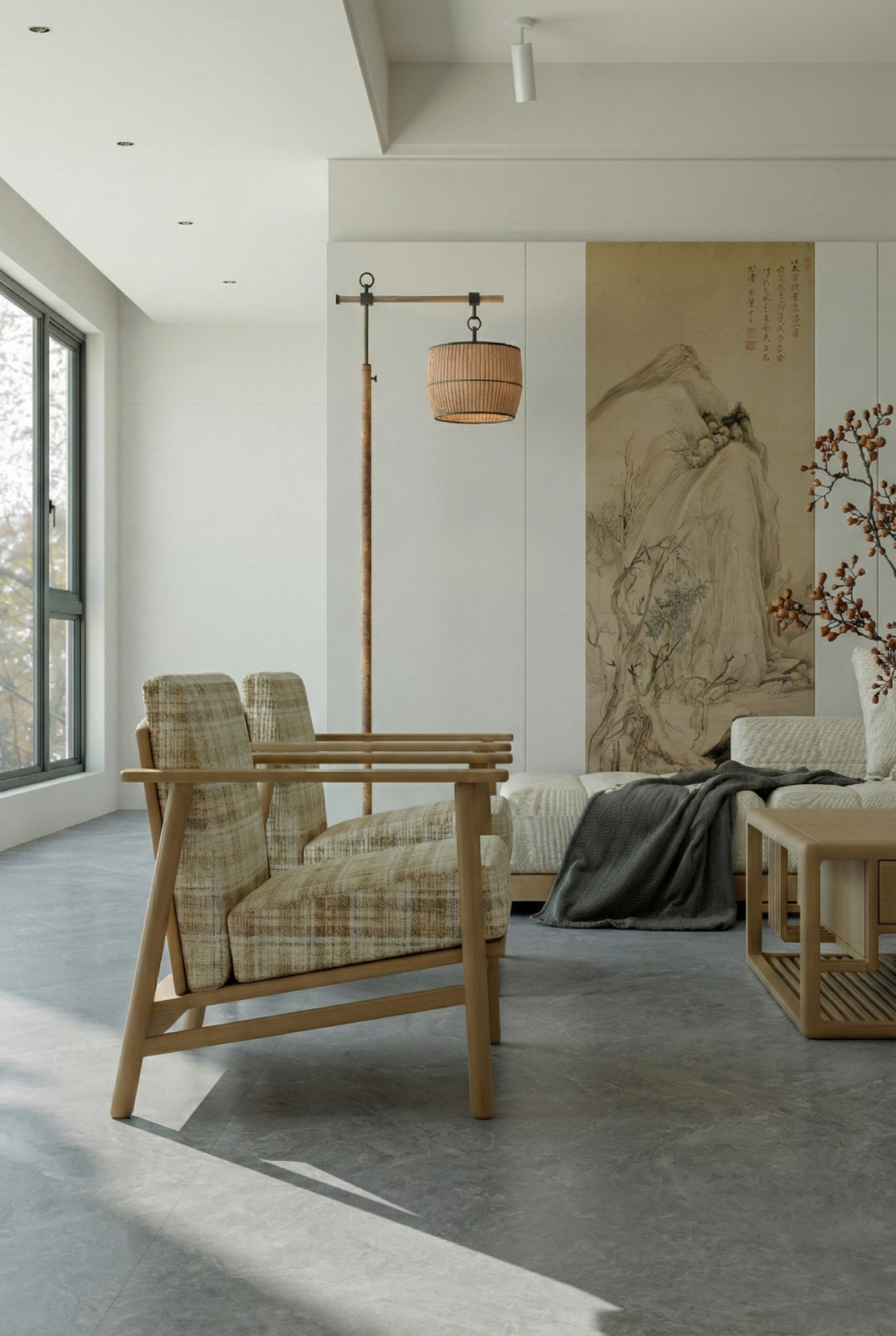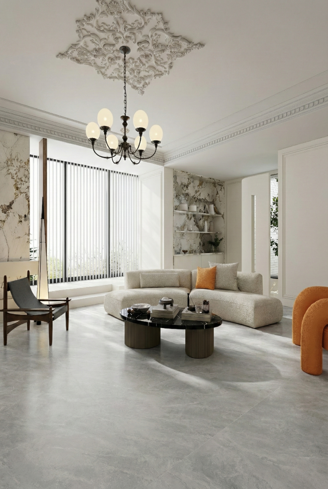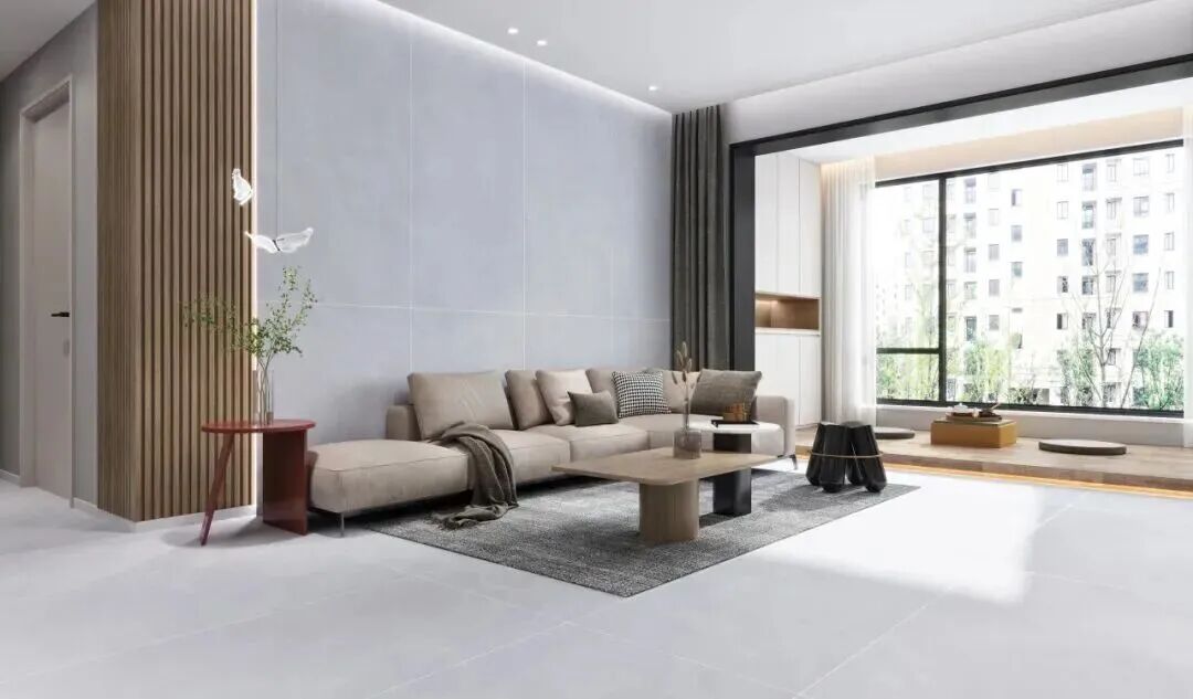 得益于超白底坯的加持,这款瓷砖的底色呈现出一种近乎无暇的暖白,淡淡的米灰脉络若隐若现,宛如上等的羊脂白玉。中国人骨子里对“玉”的温润有着天然的向往。白玉兰那种内敛、莹澈质感,契合了新中式“雅致、静谧、富有文化底蕴”的审美诉求。